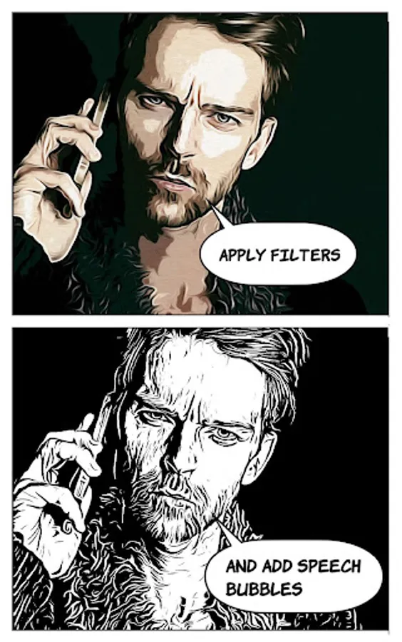 This comic foto app is meant to be easy to use and its simple design guarantees great user experience. Also, it runs lightly and even older smartphones won’t have problems with it. The “photo to cartoon” option is free, as well as the speech balloons, but if you want to bring things to the next level, you can purchase additional features from the “Big Sale” section. Are you a “big spender”? Even if you are not, you are definitely fit to fully enjoy this photo to comics app.