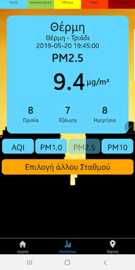 In the application, measurements from the first suspended particulate matter monitoring and recording stations in the Municipality of Thermi with the implementation of the Atmospheric Physics Laboratory of the University of Patras are presented in almost real time.