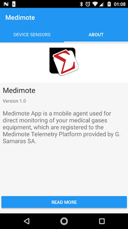 Medimote App is a mobile agent used for direct monitoring of your medical gases equipment, which are registered to the Medimote Telemetry Platform provided by G. Samaras SA.