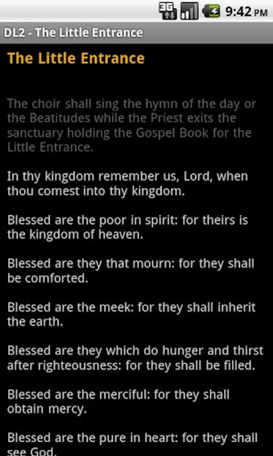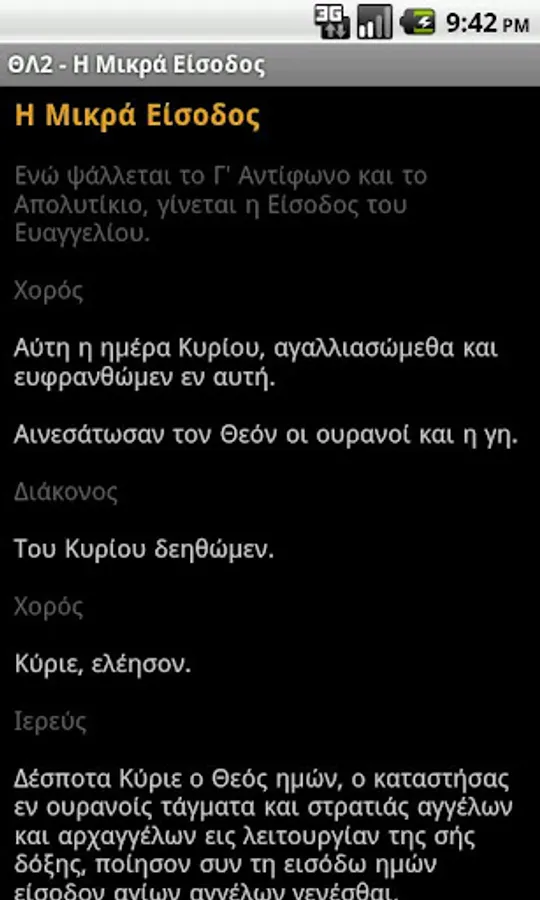 Η εφαρμογή αυτή περιέχει κάποιες από τις Ακολουθίες της Ορθόδοξης Εκκλησίας. Για κάποια κείμενα συμπεριλαμβάνονται επιπλέον και η νεο-Ελληνική μετάφραση καθώς και η Αγγλική μετάφραση.