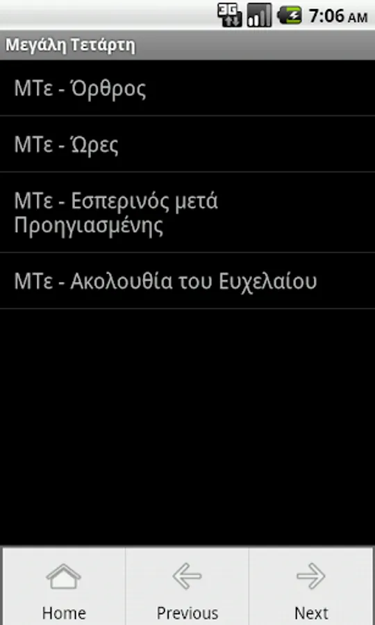 This application contains the texts for some of the Services of the Greek Orthodox Church. It contains the original Greek text, and for some Services also the Modern Greek translation and the English translation.