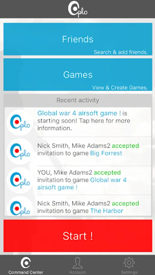 - Create GAMES (events like an Airsoft session) and invite your friends to participate.