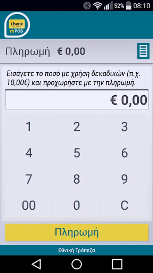 The application is used only with the Ingenico iCMP mPOS device, and the merchant or business must have a contractual agreement with NBG for the acceptance and clearing of card payments. An Internet connection is required.