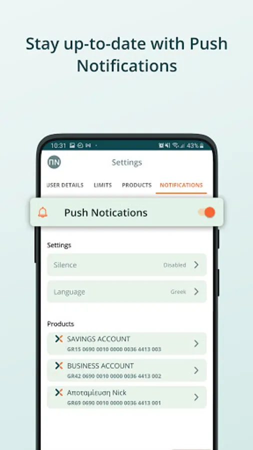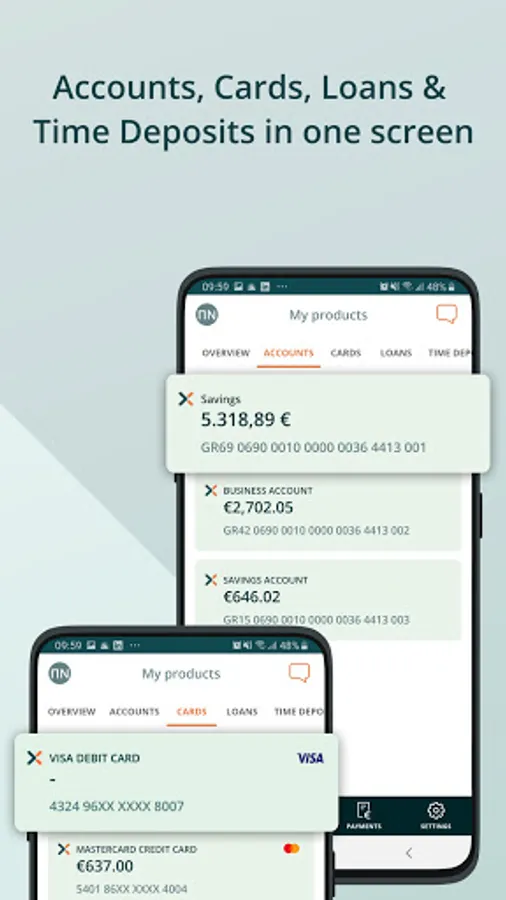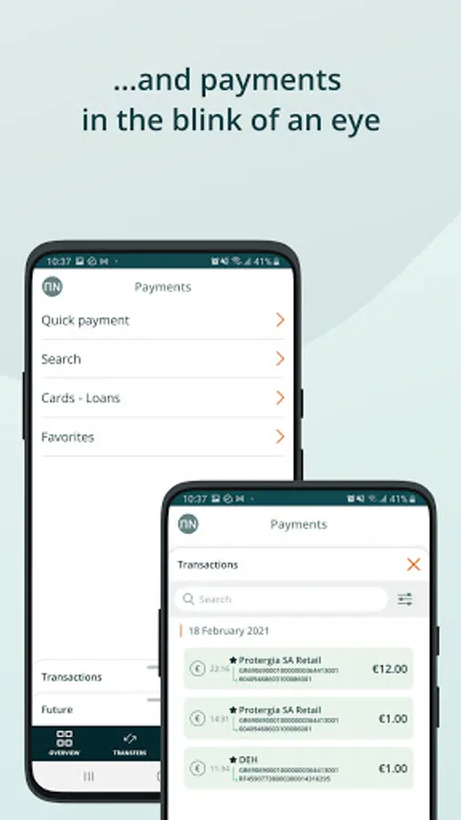 Check your balance and transaction history of accounts, cards, loans at a glance. Download account and loan transactions to your mobile device in .pdf document. Get informed about every transaction and change of accounts and cards balance by enabling push notifications. Pay your bills, taxes, credit cards of our bank or other Banks. Make a fast payment by entering an electronic payment code (RF CODE). Αuto fill the RF CODE by scanning Qr code/Barcode. Easily and quickly locate the payment you want to make, through smart categorization.