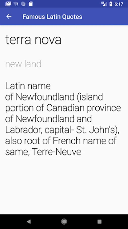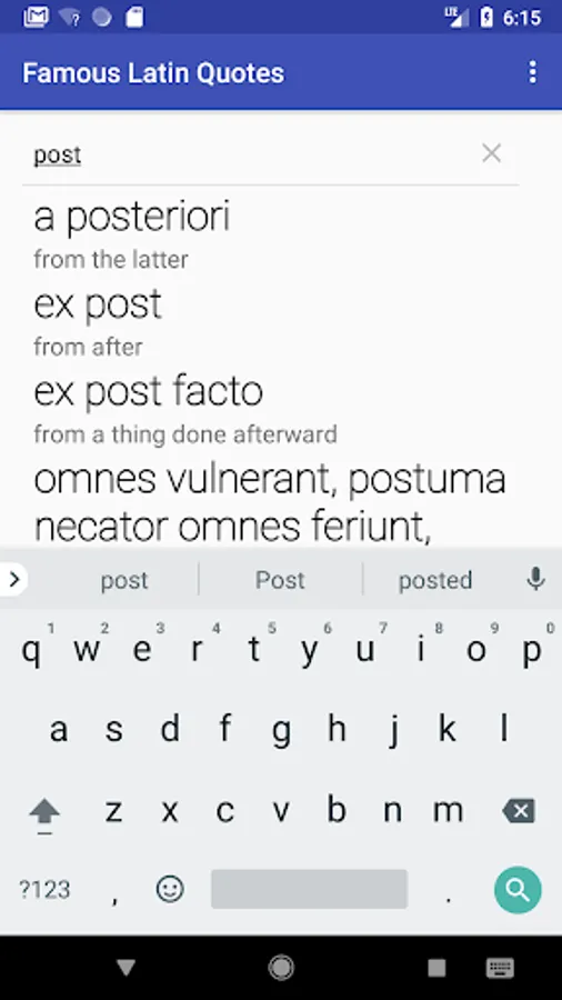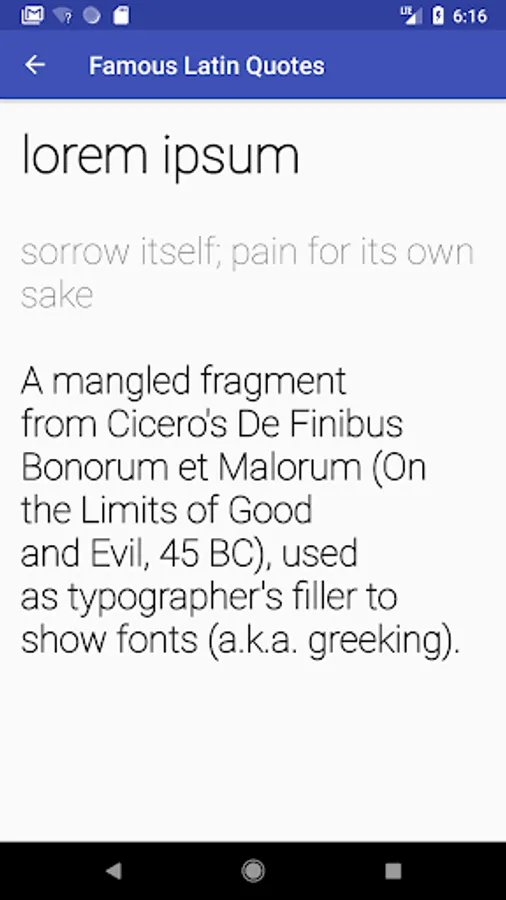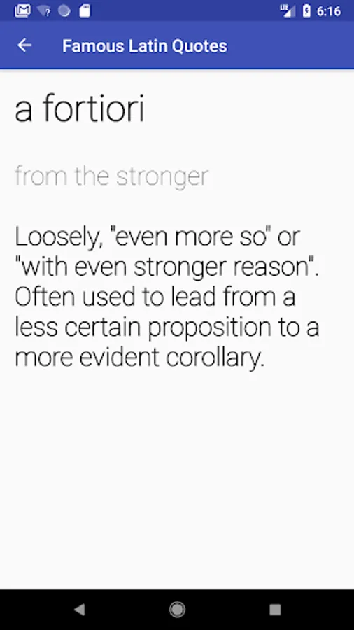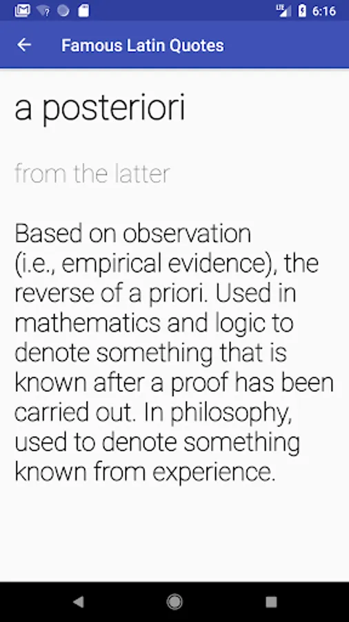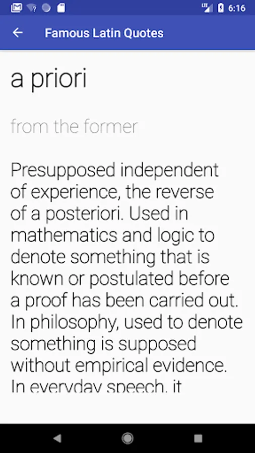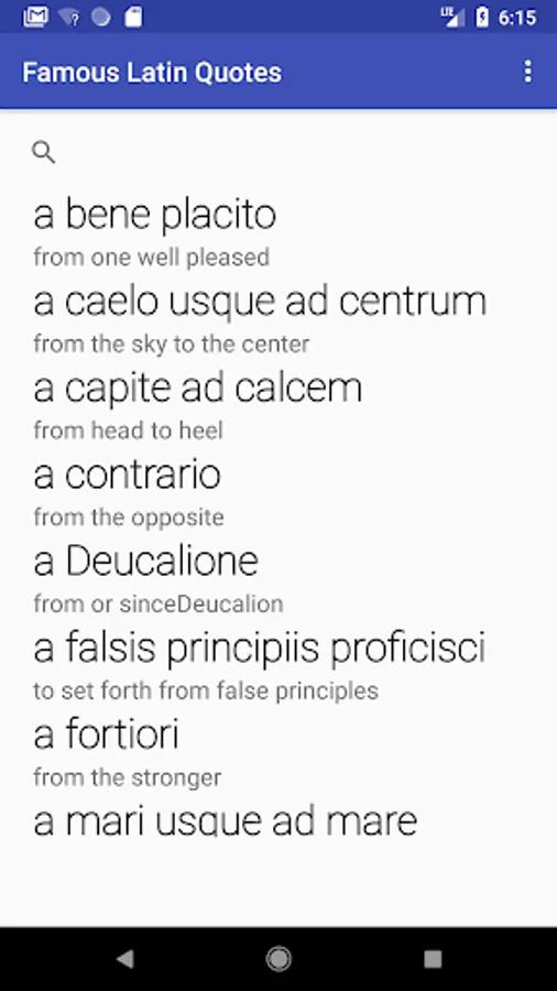 This app gets its content from Wikipedia (https://en.wikipedia.org/wiki/List_of_Latin_phrases): It lists direct English translations of common Latin phrases, such as veni, vidi, vici and et cetera.