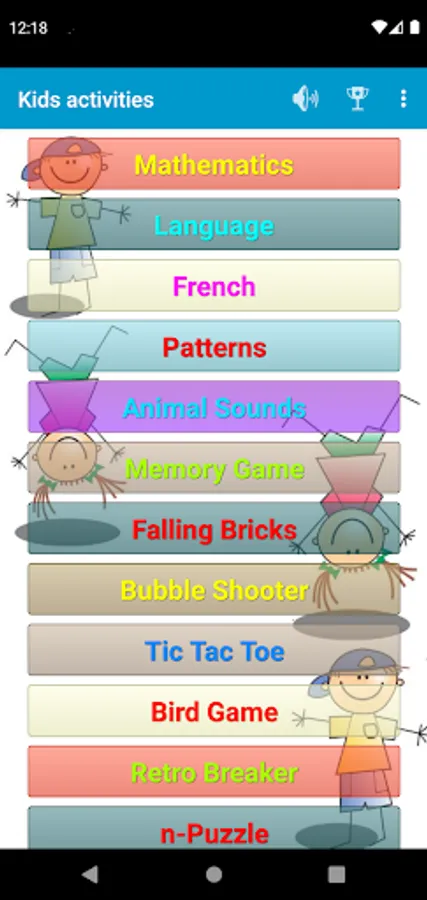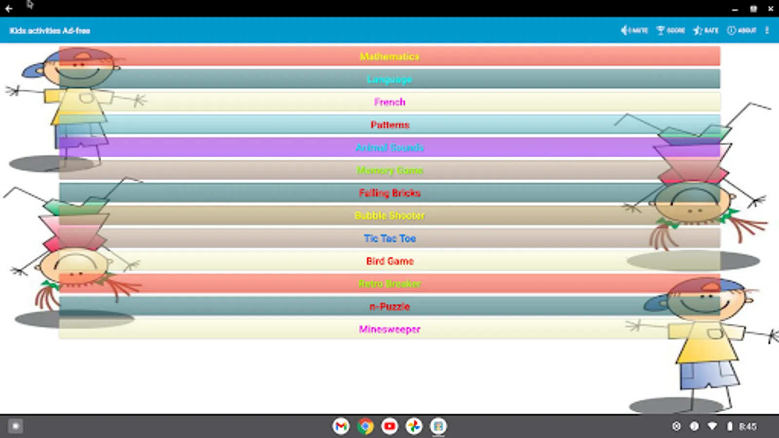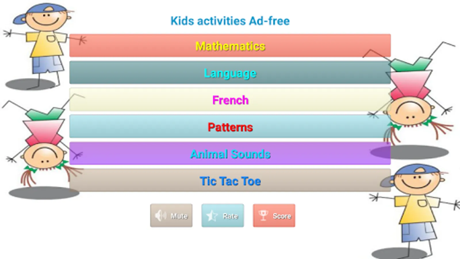 An entertaining application for children of preschool and primary school. Includes learning activities (counting, math, English and French language exercises) and fun (animal sounds, memory game, bird game).
