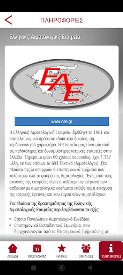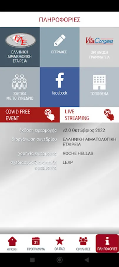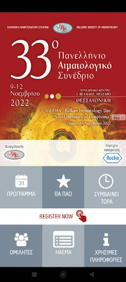 The conference is organized by the Hellenic Hematology Association (EAE) and the application is a kind sponsorship of Roche Hellas. EAE is one of the oldest and most dynamic medical companies in Greece. Today it counts 60 years of presence (founded in 1961) and has 1219 members. Within its framework, 10 Scientific Departments operate that cover the entire spectrum of Hematology.