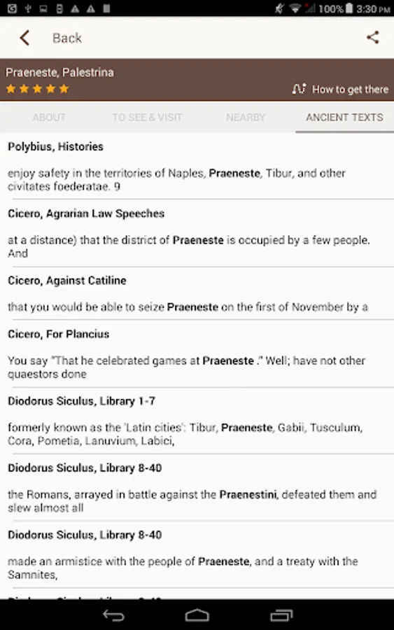 History information about Rome and other sites is complemented by ancient texts written by Cicero, Augustus, Julius Cesar, Virgil, Horace, Appian, Pliny, Plutarch, Tacitus and many other famous classic authors, making the app suitable for use by Classics teachers and students.