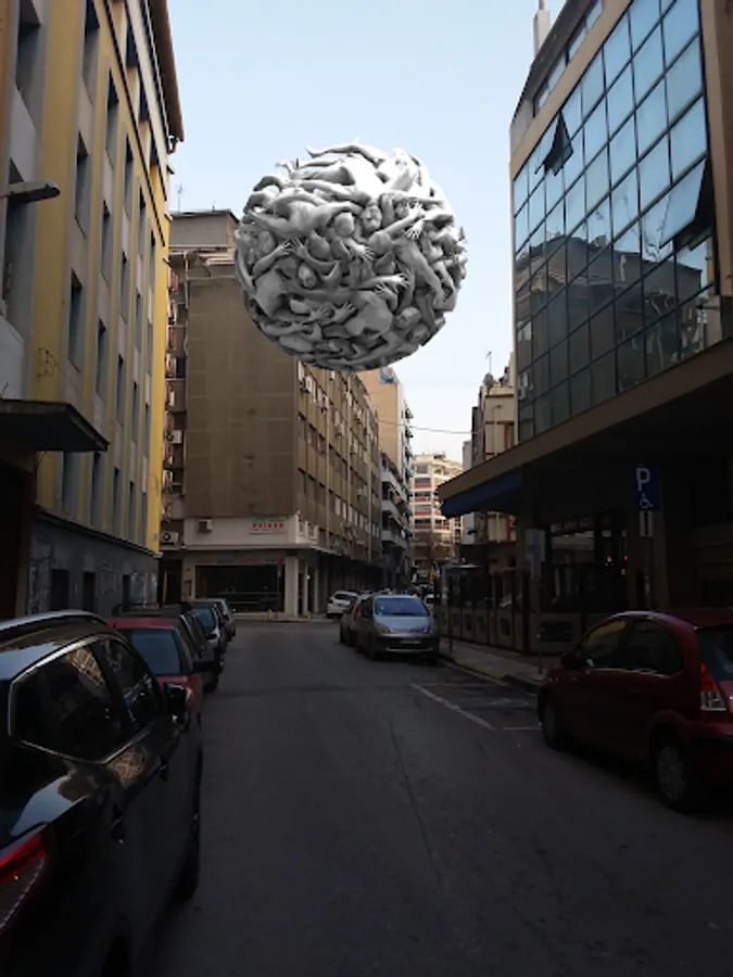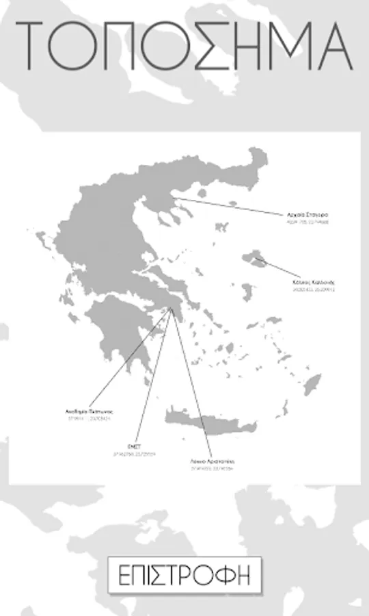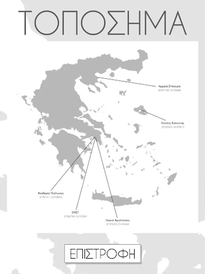 The "landmarks" Babis Venetopoulos (Programming: George Venetopoulos) is an augmented reality project (Augmented Reality). The 3D animation composition, diagnosed with GPS, by applying the internet. on mobile or tablet of the visitor network five geographical points: In the space of the exhibition, in Stagira (Aristotle's birth), in Plato's Academy (apprenticeship), high school (teaching) and over the Gulf of Kalloni (Research in Biology ).