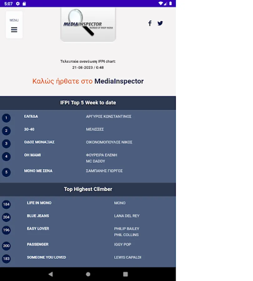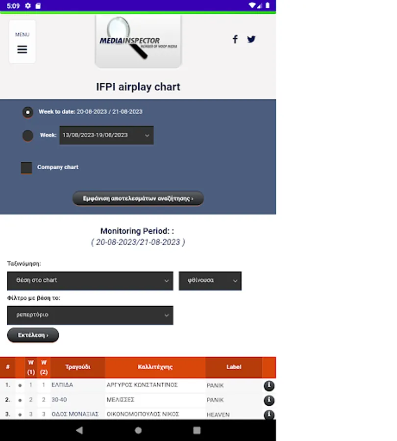 Greece's official and largest radio and t.v airplay monitoring service, providing real time reporting, music charts and statistical tools for radio and television broadcasters, music media, record companies, advertising agencies and industry analysts. Our advanced audio recognition technology provides extremely accurate independent broadcast verification of songs and commercials from radio and TV stations throughout the country. MediaInspector is the official IFPI partner for generating Greece's TOP200 airplay chart.
