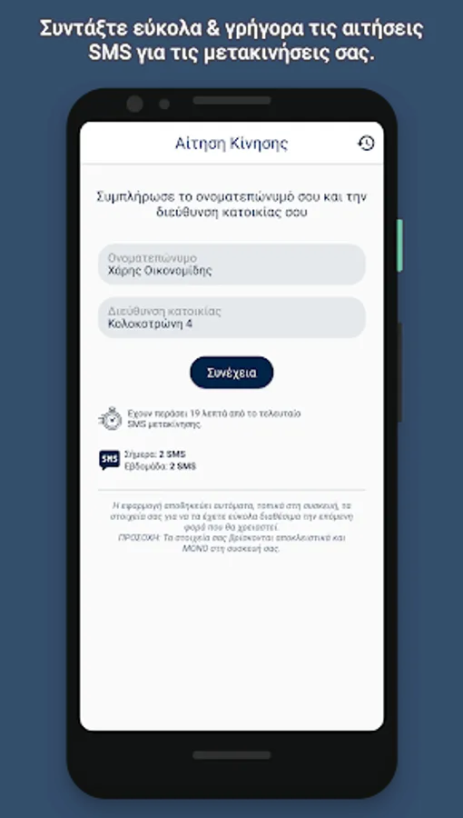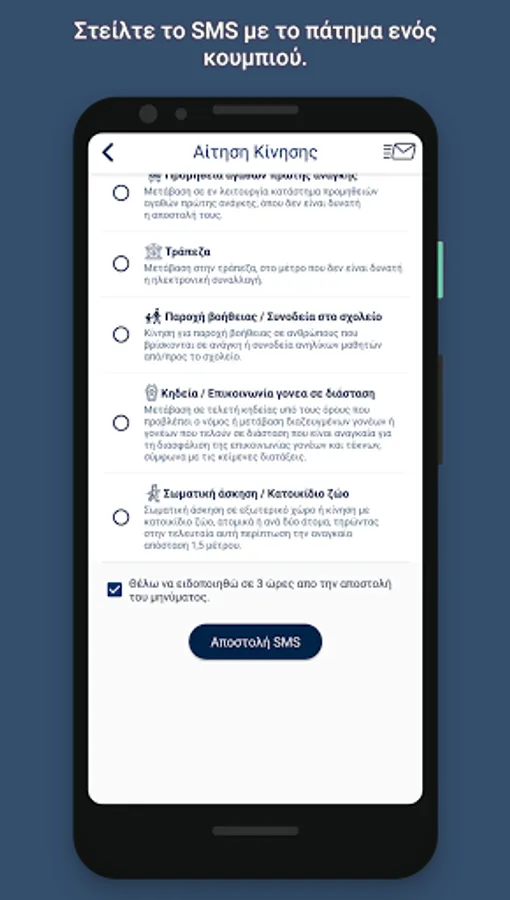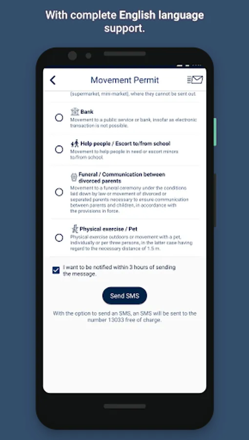 The "Movement Permit" application was created in order to make it easier for users to write the necessary SMS for their movement. Through an easy selection process the app creates the correct movement request text which with the push of a button the user can send by SMS to 13033.