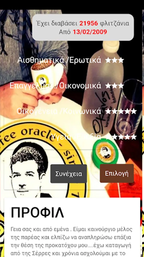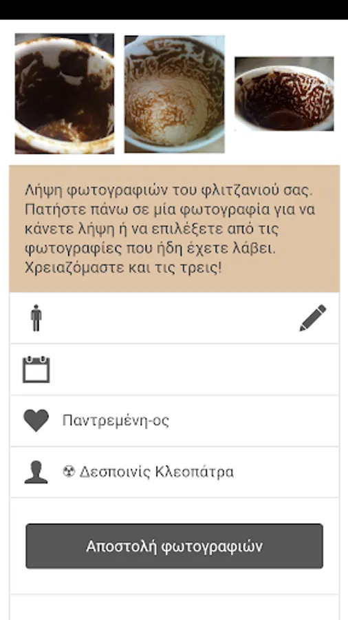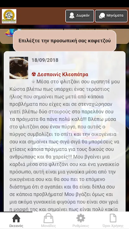 - Ability to send Cups with other people through your own account, temporarily changing personal details. Forecasts are fun and exciting! With personal forecast you will receive from our "Kafetzou", the Sun Effie, the Sun Mary, Miss Laurel and many others will be delighted and will spend enjoyable moments.