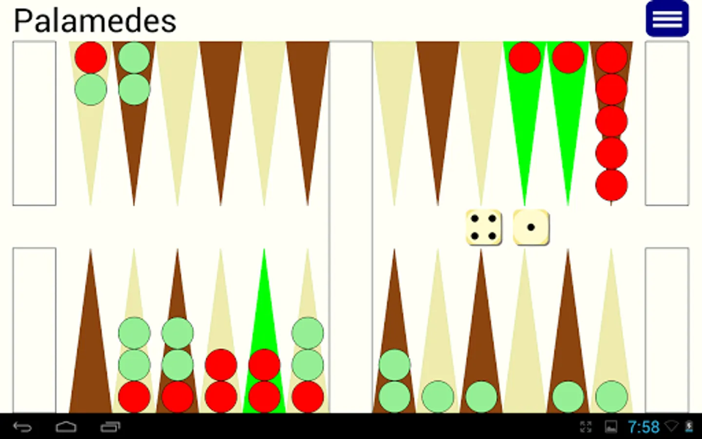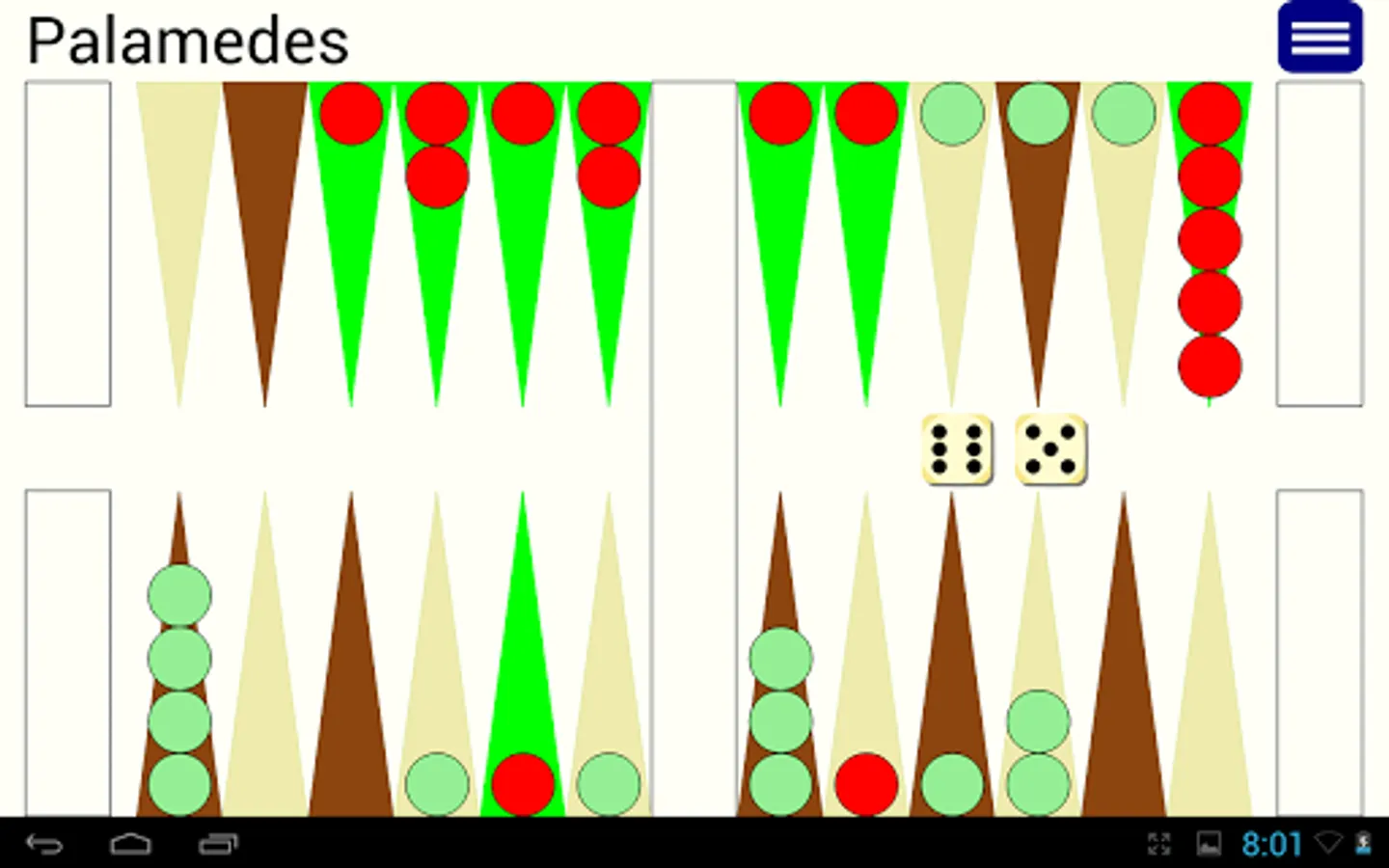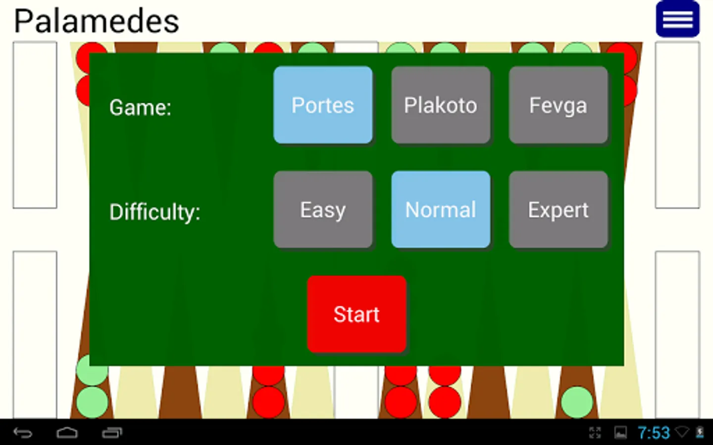 Play backgammon variants Tavli, Portes, Plakoto, Fevga against world class AI. Palamedes has won the computer backgammon championship two times (2011, 2015).