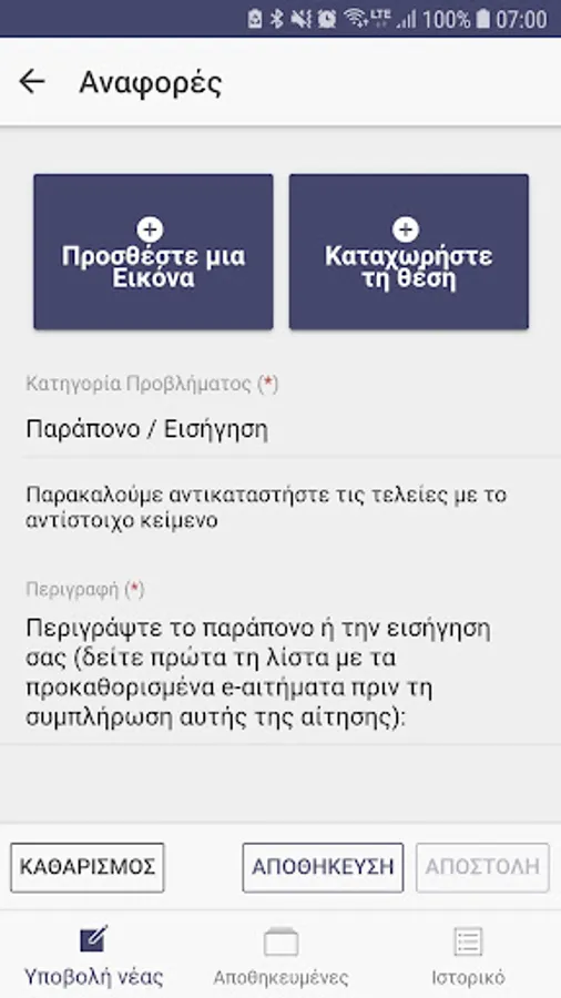 Problems are reported locally or if there is no network connection, they are stored and submitted to a later stage. View status for user-submitted problems