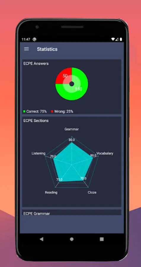 The app helps you learn the critical concepts tested on the ECCE (Examination for the Certificate of Competency in English) and the ECPE (Examination for the Certificate of Proficiency in English) exams with demanding questions. As you practice questions, the app tracks your performance and highlights your test strenghts and weaknesses, helping you focus on each section individually.