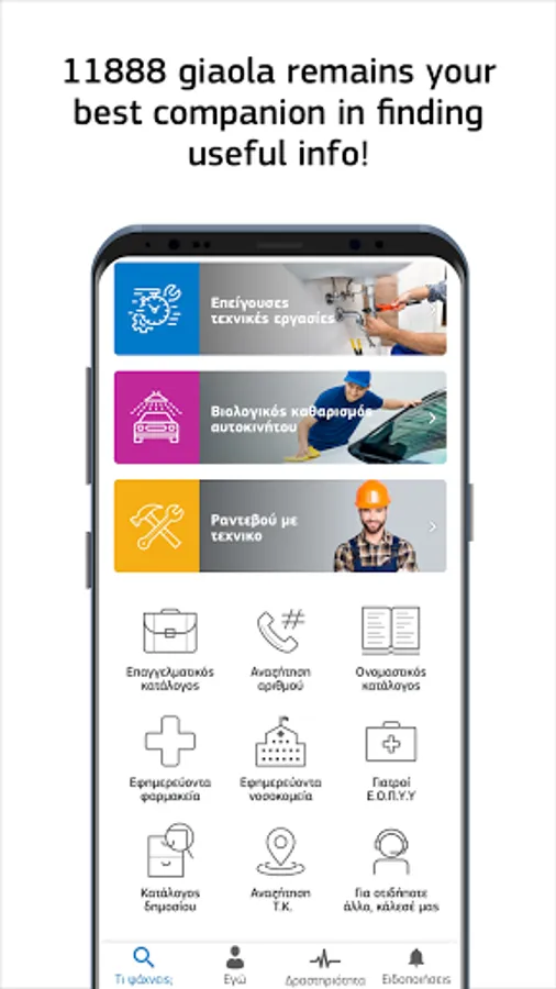 Through the new 11888 giaola app, you can search contact details of individuals, businesses, health institutions, public services and book an appointment with technicians for every urgent request. You can also find special offers in services related to your home, car, children, beauty care, financial and legal needs, as well as an array of daily necessities, wherever you are currently located.