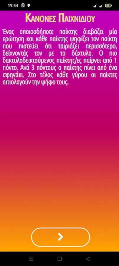 Any player reads a question and each player votes for the player he thinks fits best, pointing to him. The most fingerprinted player gets 1 point.