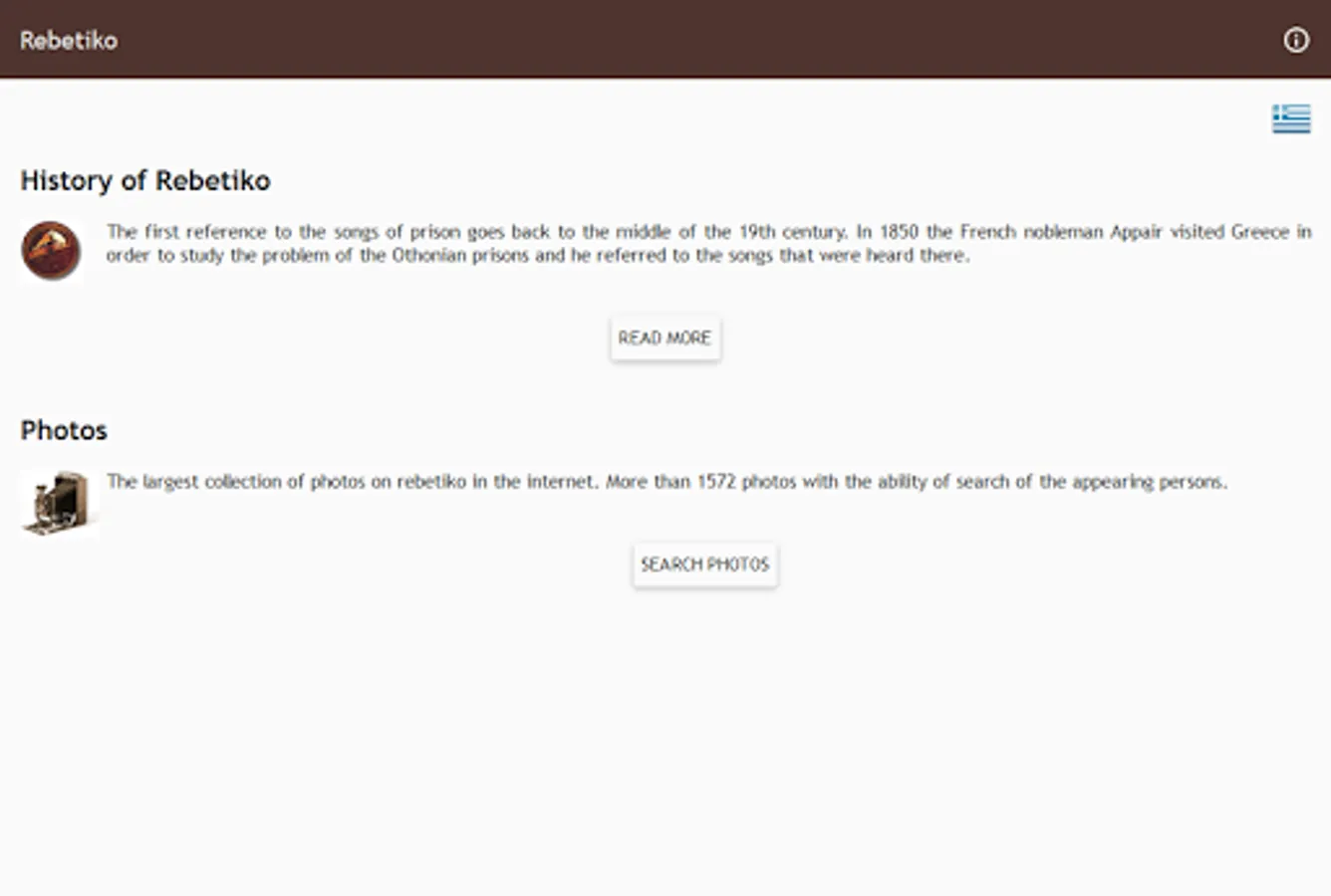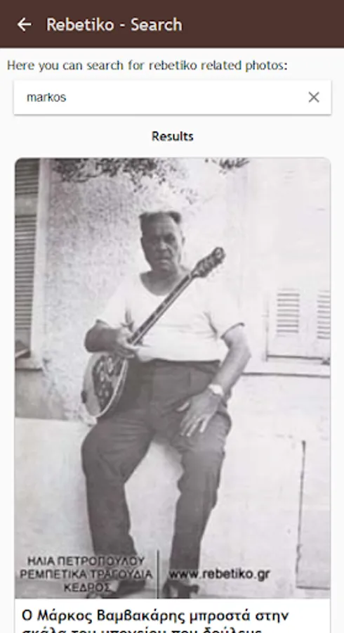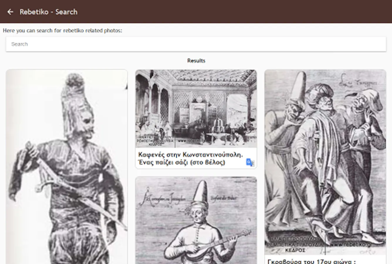 The rebetiko.gr application contains a brief history of rebetiko and the largest collection of photos on rebetiko in the internet.