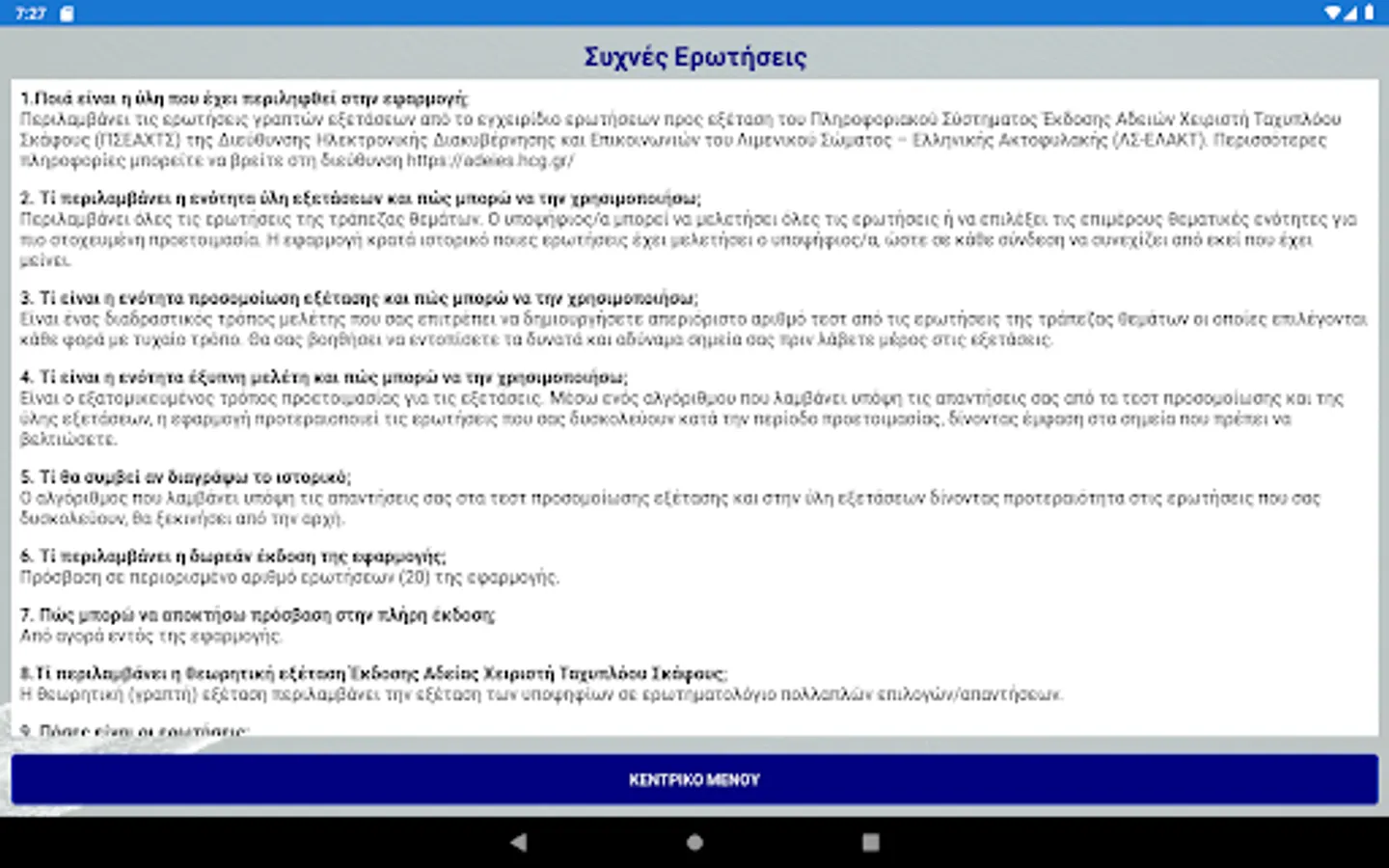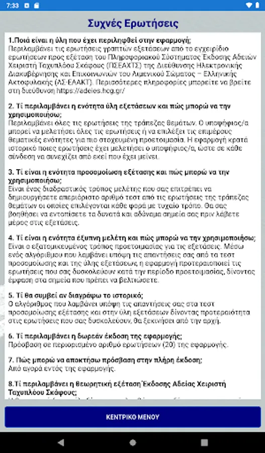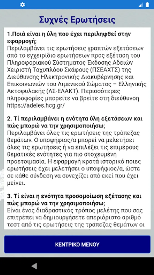 The questions will be updated following the information & publication program of the e-Government and Communications Directorate of the Coast Guard - Hellenic Coast Guard (LS-ELAKT).