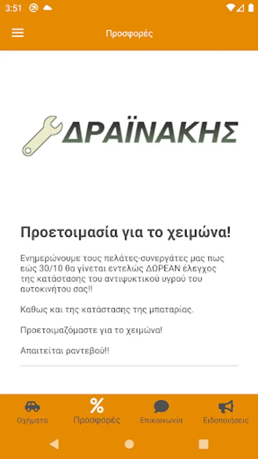 The Drainakis CSM application is a pioneering application for the data of the country's workshops. Replaces the classic vehicle maintenance book with an electronic one. Every work performed is registered either by us or by the client. Please note that the first registration must be made by our workshop. Notifications of scheduled future tasks are sent as well as notifications of possible offers for some periods. Supports more than one vehicle per user. It is a tool for organizing their vehicle maintenance file.
