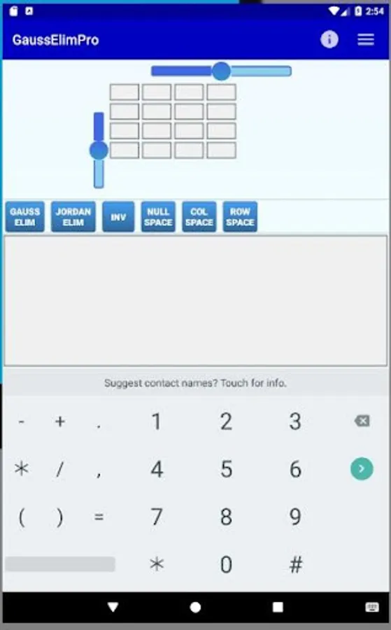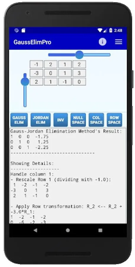 Gauss Elim is a simple calculator that applies the Gaussian Elimination process to a given matrix. GaussElim uses fractions and makes precise calculations. You can set the matrix dimensions using the scrollbars and then you can edit the matrix elements by typing in each cell (the cells become active/inactive once you move the respective scrollbar). You can move to another cell either by pressing the NEXT key on the soft keyboard, or by tapping the desired cell.