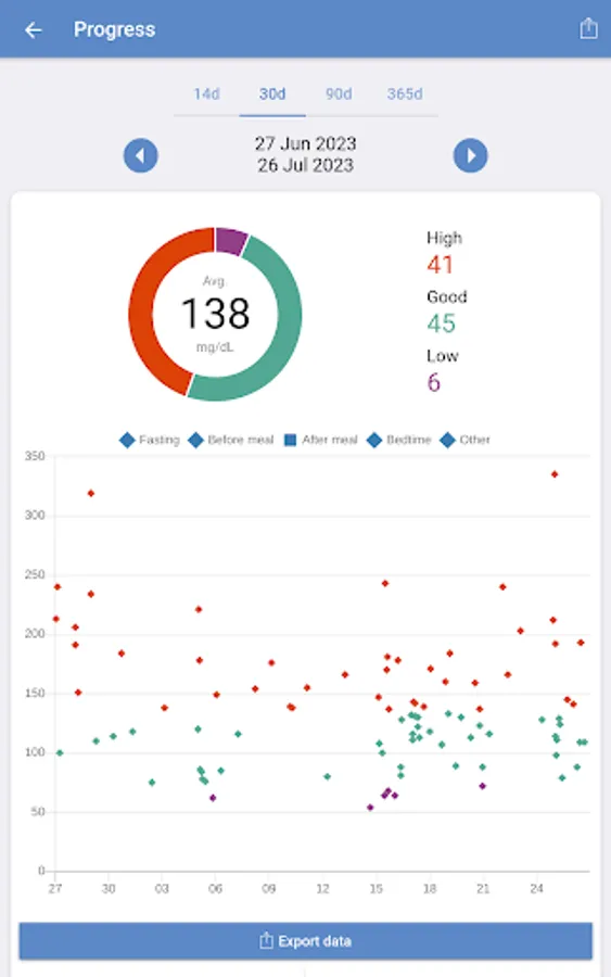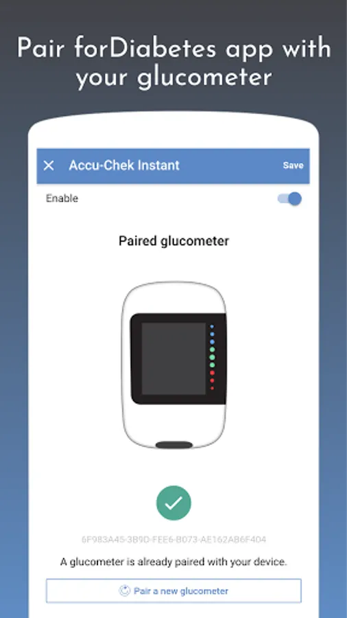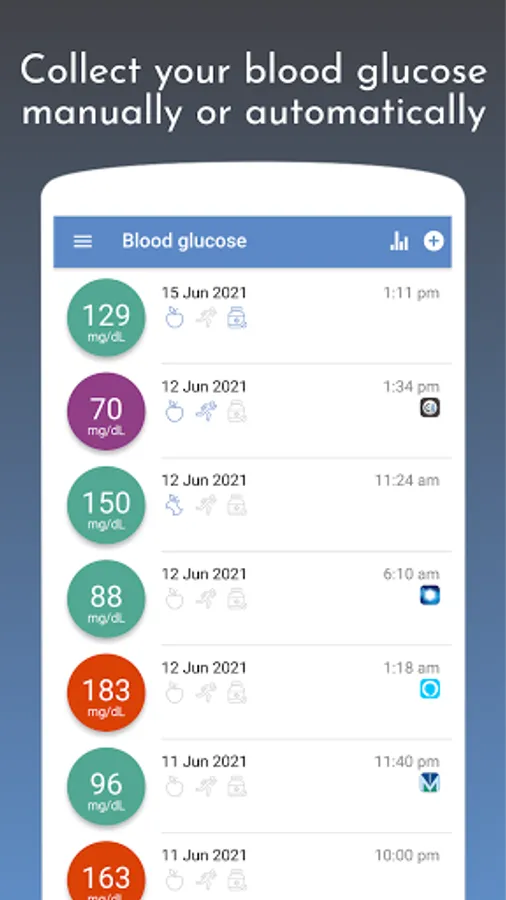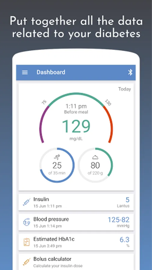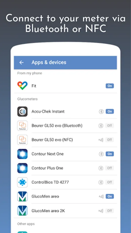 - Automatic data entry using 3rd-party apps and glucose meter devices with Bluetooth or NFC connection like: Google Fit, Fitbit activity trackers, Contour Next ONE & Contour Plus ONE glucometers, GlucoMen areo & GlucoMen areo 2K glucometers, Accu-Chek Instant, Beurer GL50 evo glucometer, Control Bios TD-4277 glucometer etc