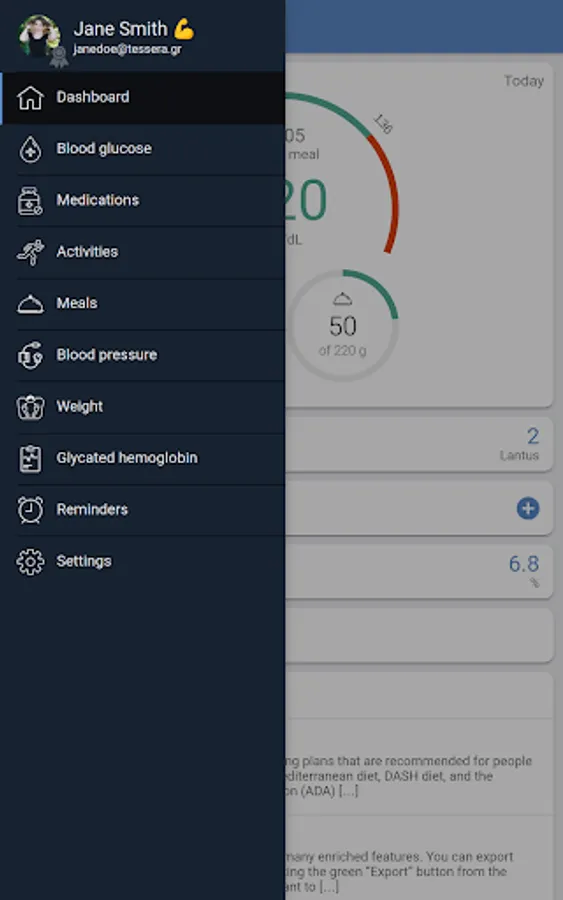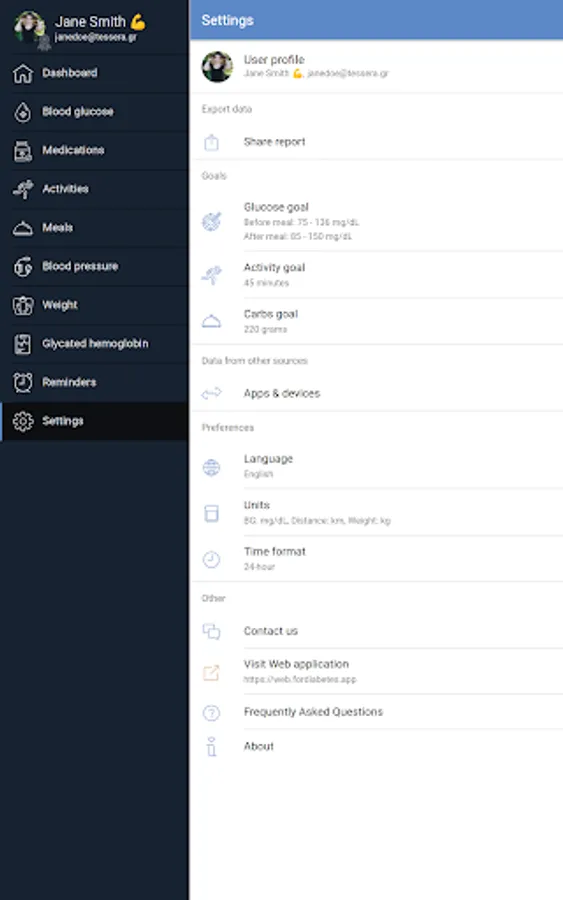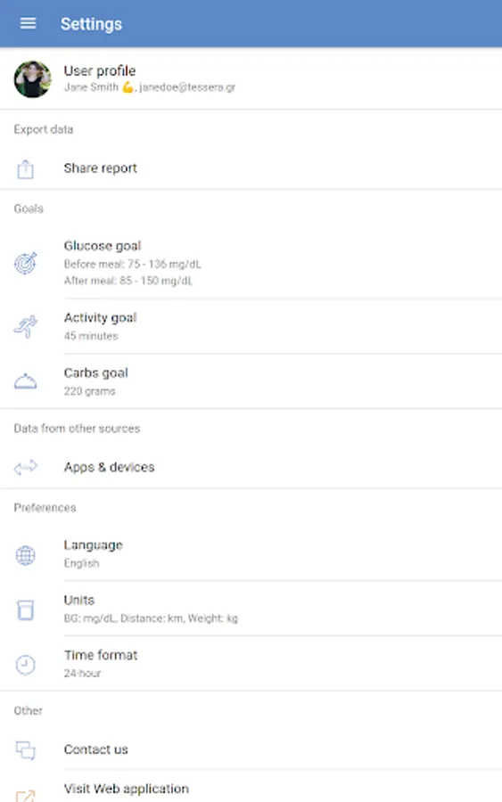 - Setup goals for: blood glucose range, daily activity, daily carbs etc