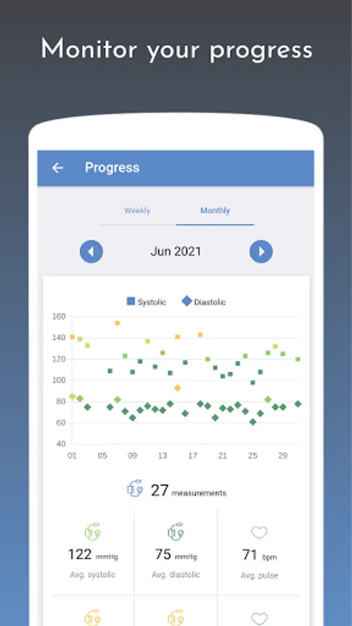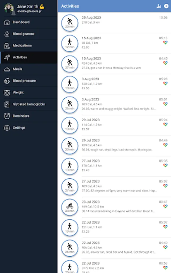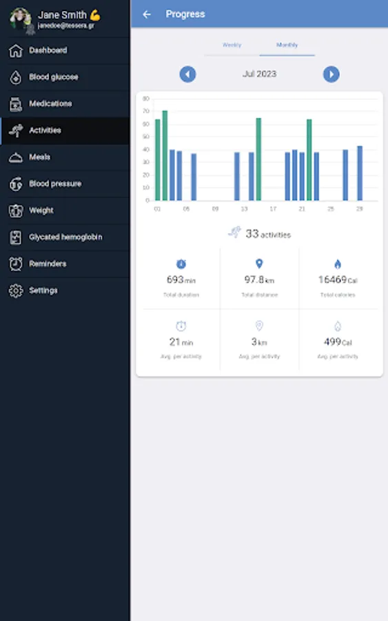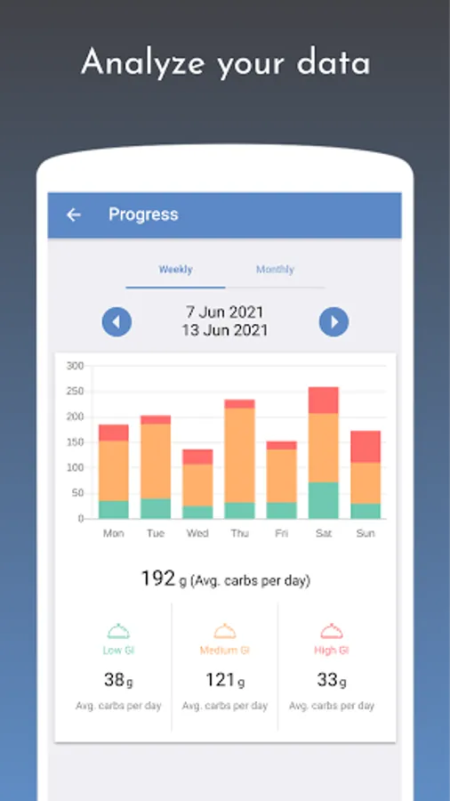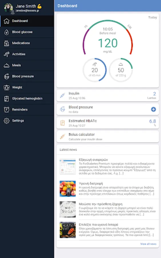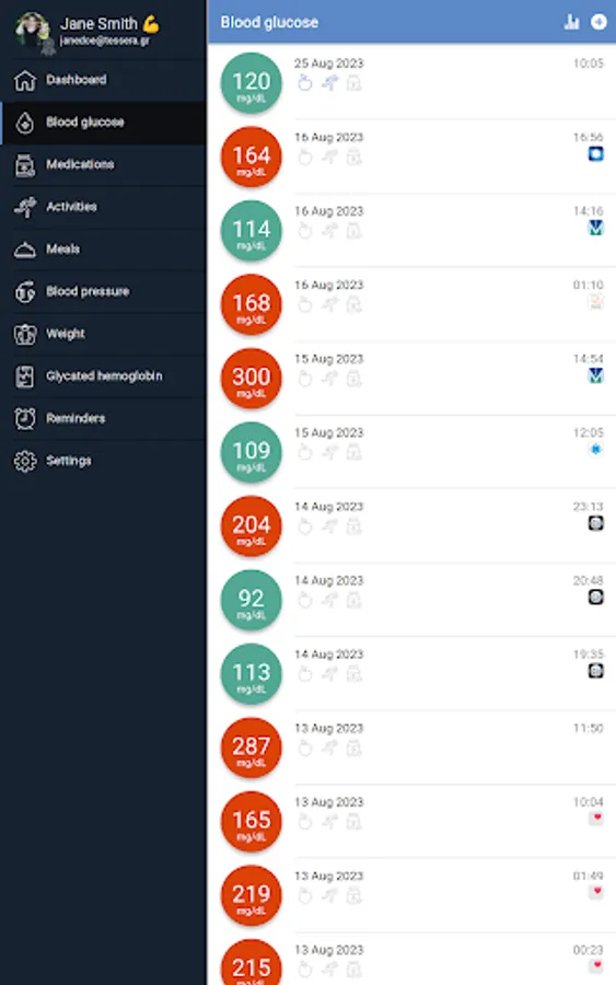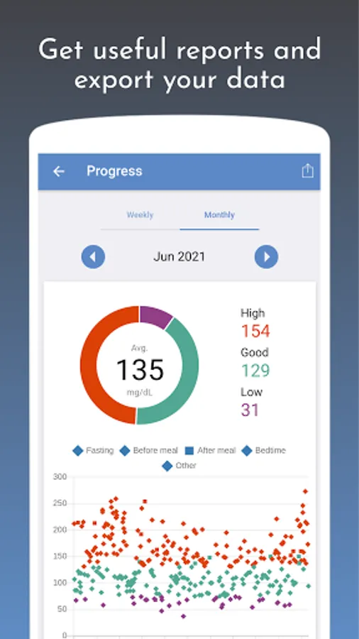 - See your progress with useful charts based on your defined goals for: blood glucose, meals, activities, weight, blood pressure etc