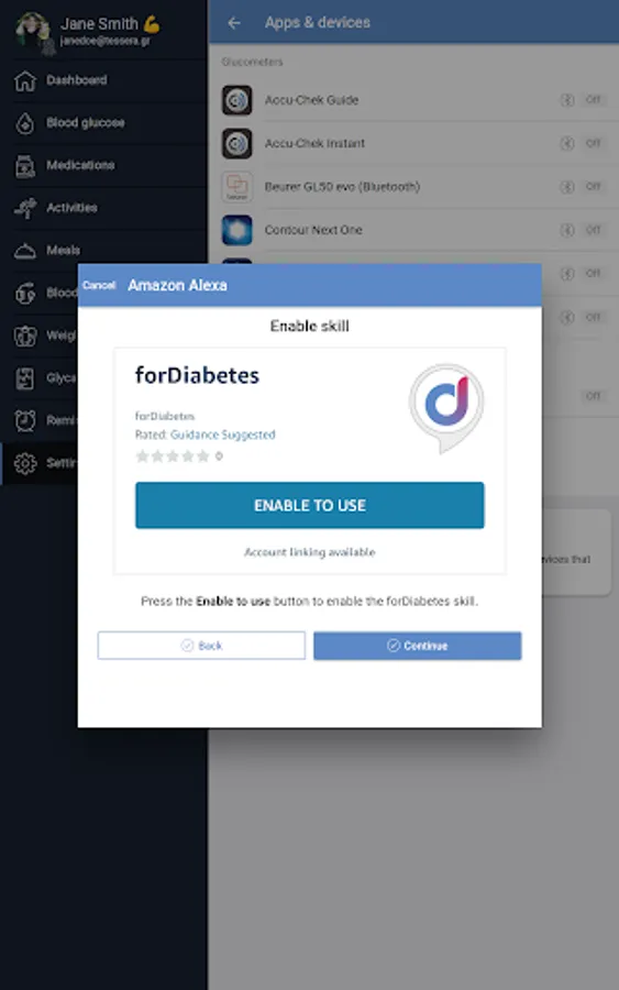 - Voice commands to add new glucose measurements and ask for glucose data from the Amazon Alexa Smart assistant