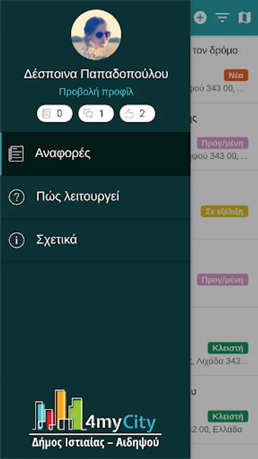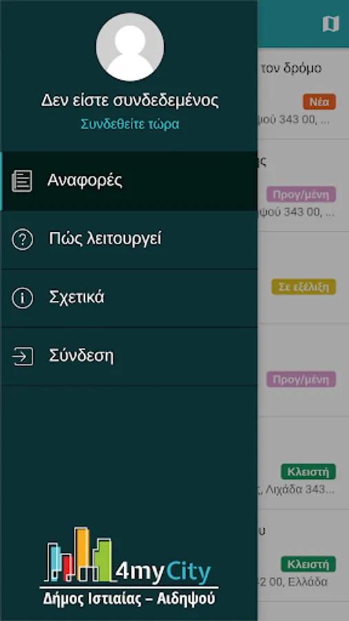 With the application ‘4myCity’ you can report to the Municipality of Istiaia-Edipsos with your mobile phone, tablet or computer directly any problem of the area and contribute to the upgrade of the quality of your life and that of your fellow citizens.