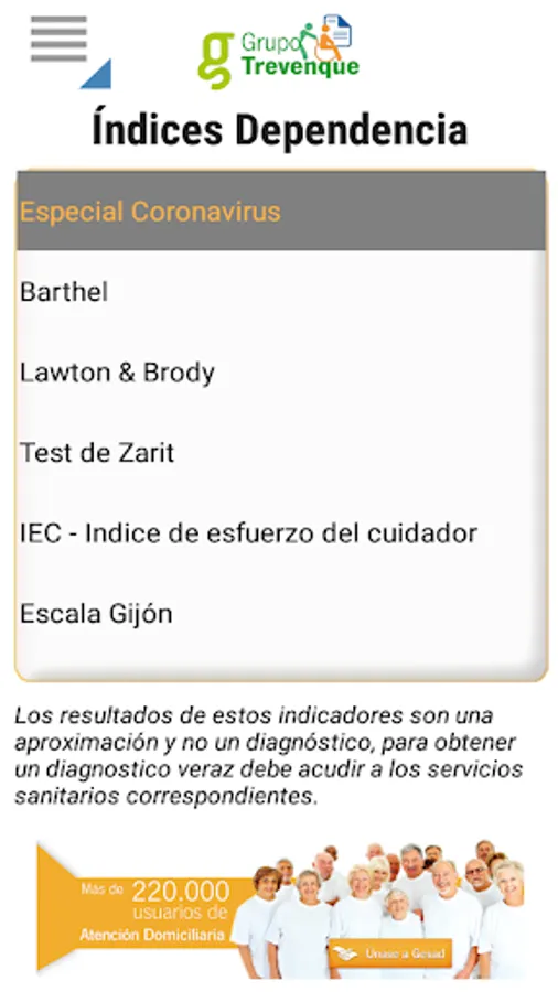 Indicators of dependence is the mobile tool that lets you calculate the principal functional values, psychoaffective and socio-familiar of the users or residences patients, day´s centres , home care, etc.