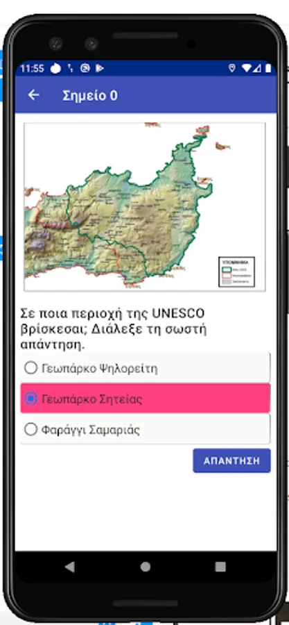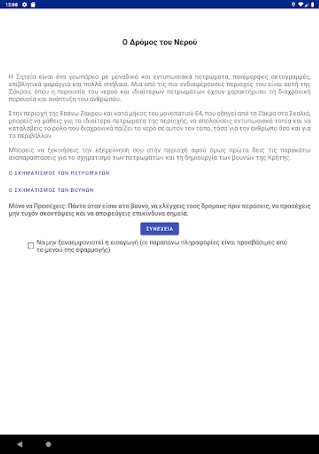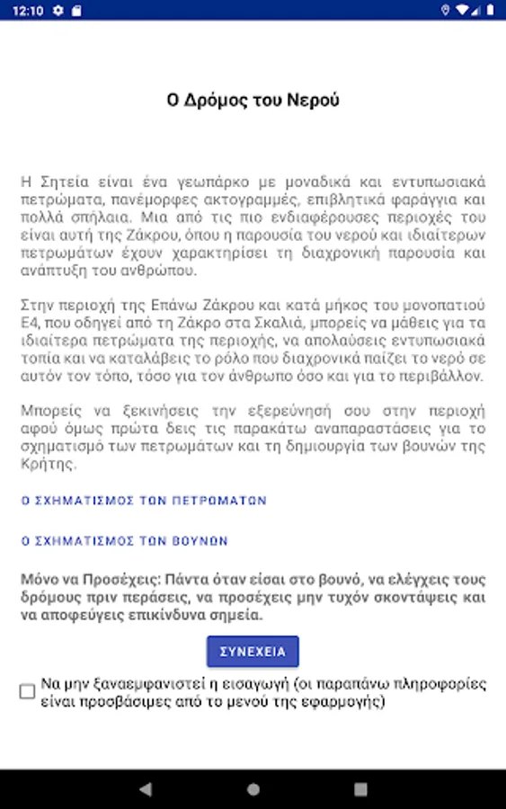 eGEO Discover is an educational application for android mobile devices that aims to provide knowledge about the geology, environment and culture of Sitia, as well as map reading, orientation and navigation skills. It was created within the framework of the action "GEO-IN: Geotourism in Island Geoparks" of Greece and Cyprus of the cooperation program INTERREG V-A Greece-Cyprus 2014-2020. The main objectives were the development of Geotourism with high quality standards, the diversification and strengthening of local economies and in general the self-sustaining sustainable development of the intervention areas.