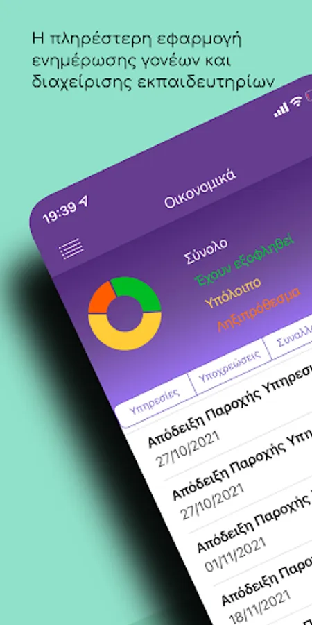 Parents get access to their financial obligations and card, view the receipts and can download it in pdf. Schools get the easiest accounting software available, and send the data to myDATA