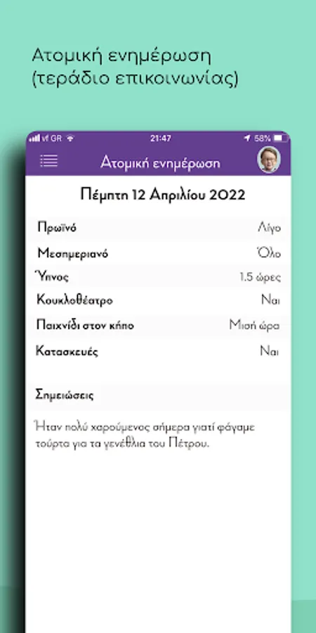 Information about the child's daily activity at school (eating, sleeping, etc). Replaces the printed communication notebook