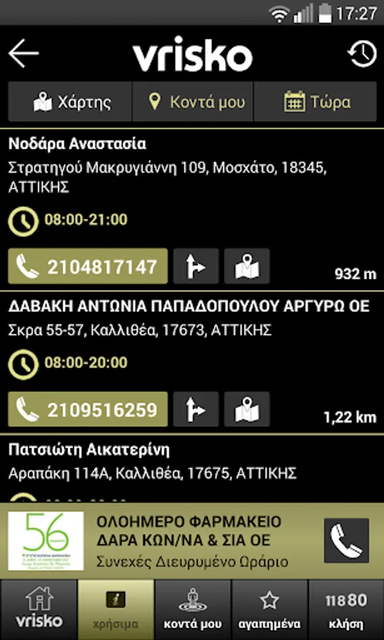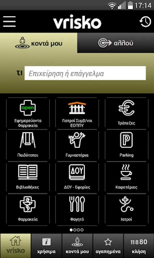 -Αναζήτηση «κοντά μου» με χρήση είτε των εικονιδίων είτε απλά γράφοντας αυτό που σας ενδιαφέρει (επαγγελματική κατηγορία ή/και επωνυμία)