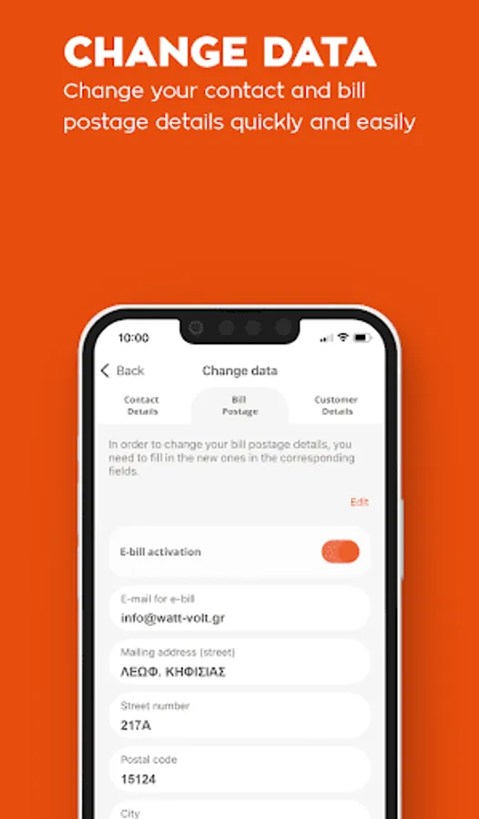 With MyWatt you can change your contact details and the bill postage information without having to contact us. The changes are done easily and with safety and your data get updated in our base immediately.