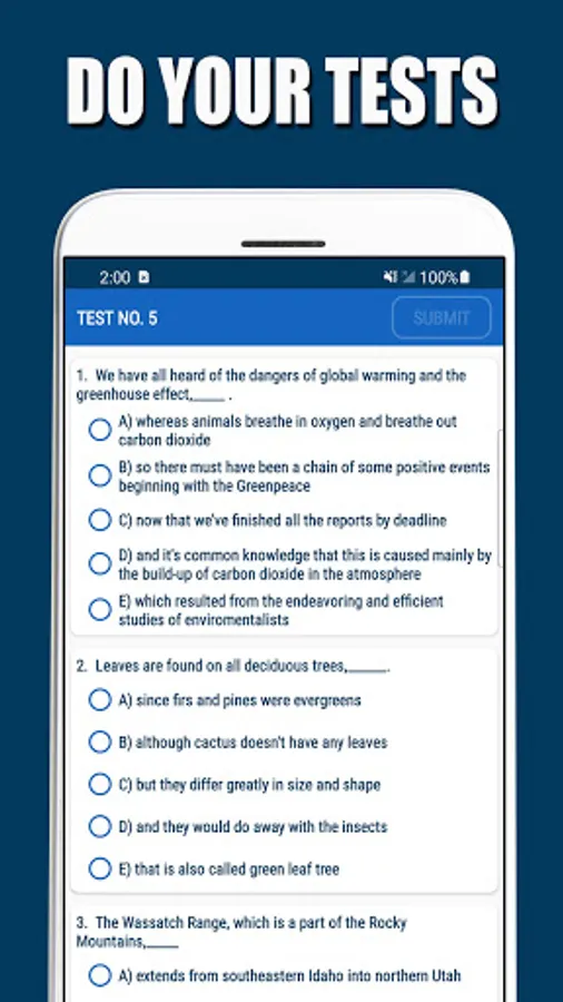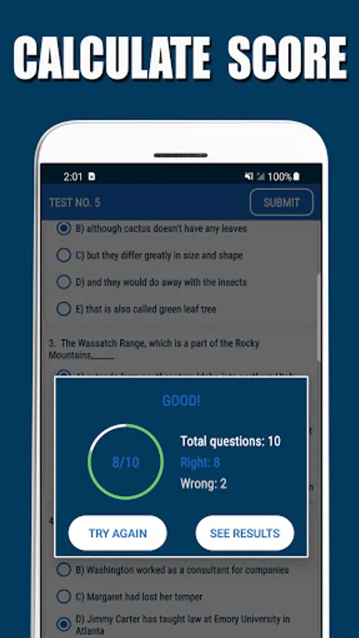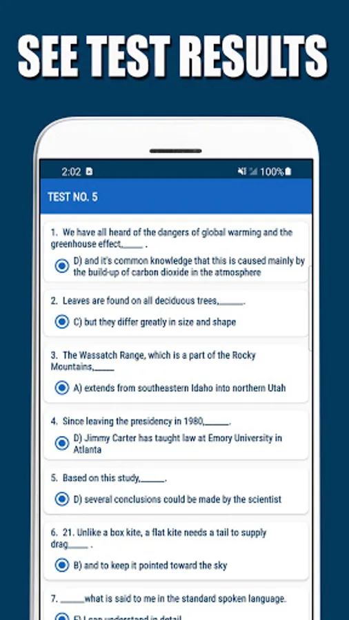 Application helps you to finish, score and check result of all test on you phone in the simple way. Let's keep daily practicing to improve your English.