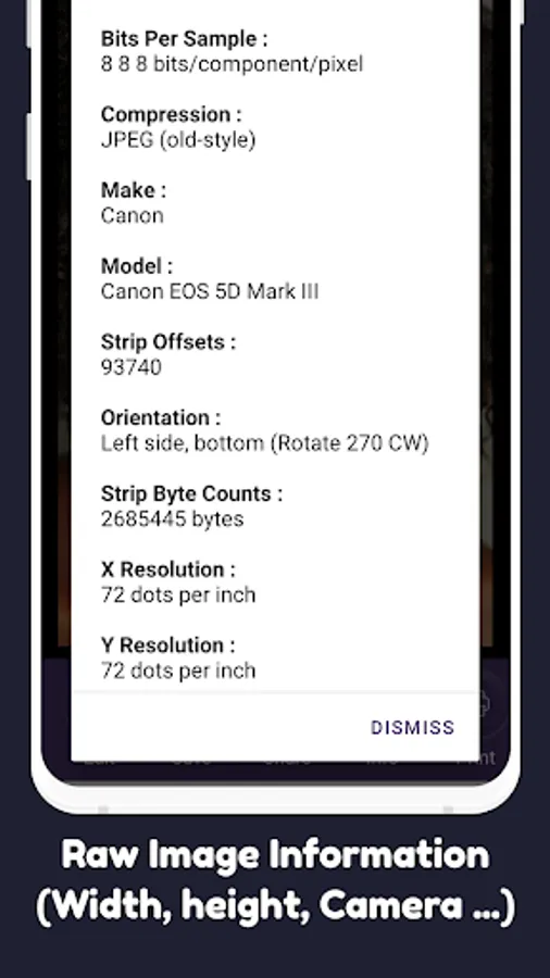 You can use this app to check an image property: Our Raw image viewer gives the user the image properties such as the X resolution, software, image make, date and time of the image, white point, image height and width, Bits per sample, compression, photometric interpretation, strip offset, exposure time, F-number, ISO speed ratings, focal length, Exif image Width and Height, file source etc.