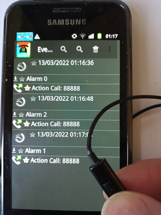 The jack headphone connector of the phone is used to make a cheap hard wired alarm. In case of alarm any sound can be played from phone speaker. At the same time a phone call is automatically dial to a chosen contact.