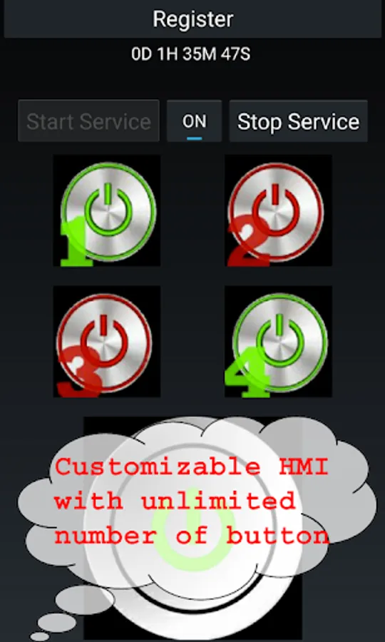 All the input and output of devices are gathered onto a simple HMI pages. For example a button “PANIC” could be configured to send a text message when it is pressed, or it can be used as a baby alarm with sound detection. The status and profiles (green, yellow or red and blue) of all alarm can be quickly monitored on a single interface. Each alarm is independently setup. Four categories menu are used to program individually the behavior of an alarm: