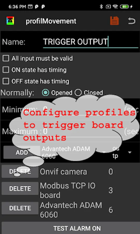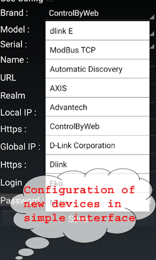 It will detect automatically ONVIF device such as camera on the local network. It has support for modern Ethernet IO board manufacturer through Restful communication and will configure automatically Modbus TCP devices. Then it can easily add the GSM capability (phone and text) in order to create an autonomous alarm coupled with phone internal sensor. Any device connected to the AlarmM application can trigger output to another device of different brand and on different network.