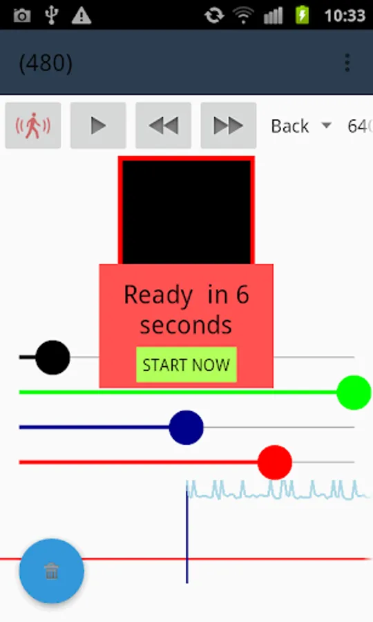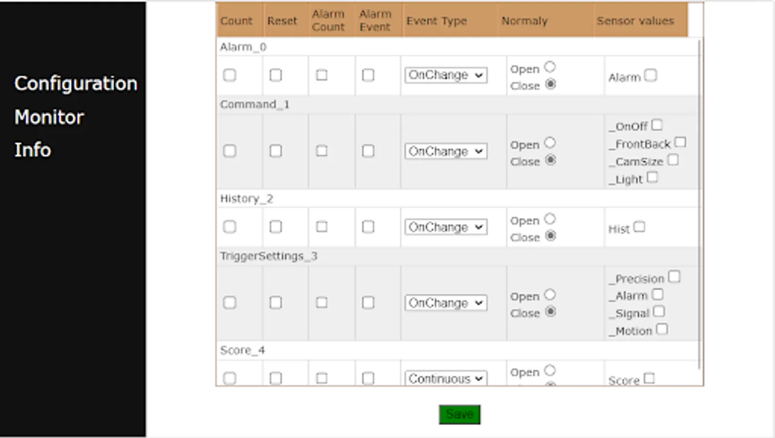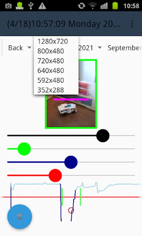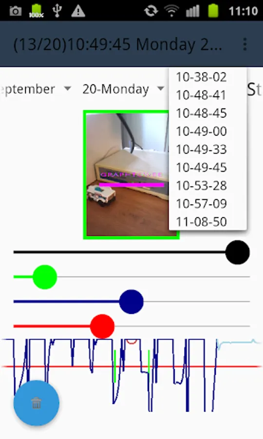 The motion detection algorithm is easily tunable thank to a real time graphics which display the detector response. Tuning of the detector is simply done with four spinners. The red spinner is allowing to setup the minimum value for triggering an alarm event. The blue spinner is scaling the amplitude of the curve. The green spinner is filtering the events (according to width) which will produce an alarm. The black spinner is smothering the sensor value. Spinner can be locked and unlocked with long press.