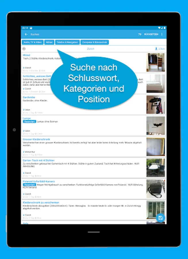 To give away app helps you to search for the keyword, categories and location in your area (within a radius of 0 to 3000 km).