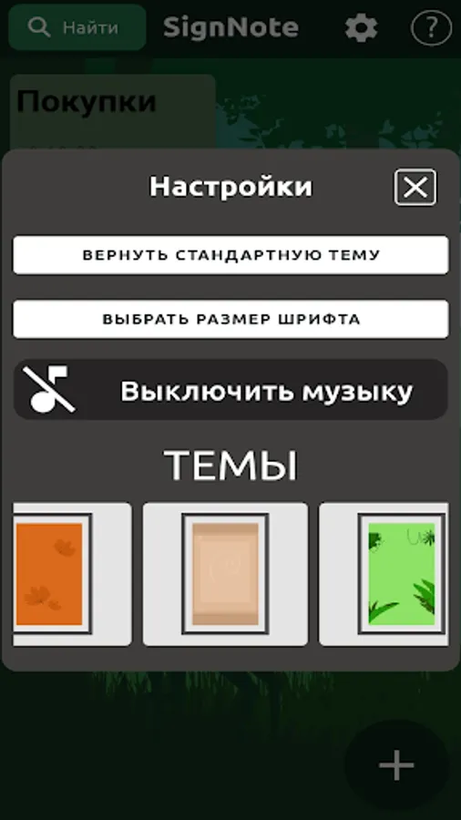 • Topics. Our application has many different themes for people of different tastes. Some of the themes have their own soundtrack and atmosphere, and will set you in a special mood for working with notes.