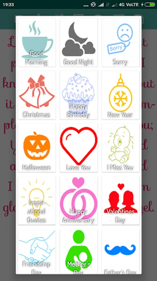 Good Morning, Good Night, Sorry, Christmas, Happy Birthday, New Year, Halloween, Love You, Miss You, Inspirational Quotes, Happy Anniversary, Valentine Day, Friendship Day, Teachers Day, Holi, Pongal, Diwali, Eid. Happy Easter, Weeding, Party, New Born Baby, Good Luck, Good Bye, Good Friday, Thanks, Giving Day, Republic Day, Independence Day.