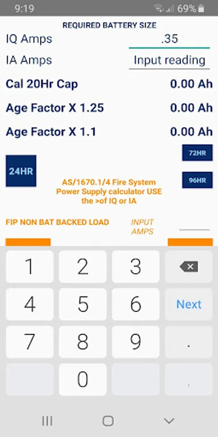 The app calculates the required Battery size and Power Supply for an installed Fire Alarm system, this includes the Fire Panel and all connected zones plus all ancillaries & outputs. The Power Supply is required to charge the battery to 90% within 24Hrs after a full discharge.