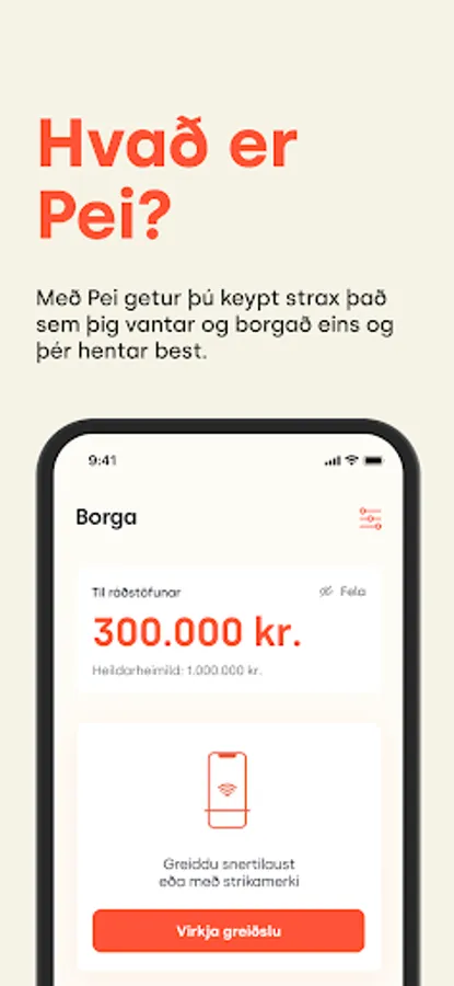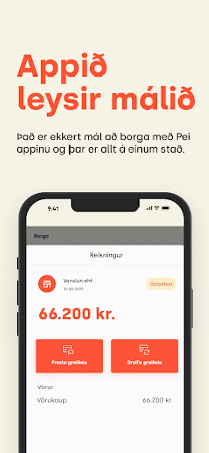 Með Pei appinu getur þú greitt með Pei í posa eða skannað strikamerki og fengið greiðsluseðil sendan í heimabanka. Þú getur breytt kaupunum annaðhvort í greiðsludreifingu eða fengið auka vaxtalausan greiðslufrest til að borga.