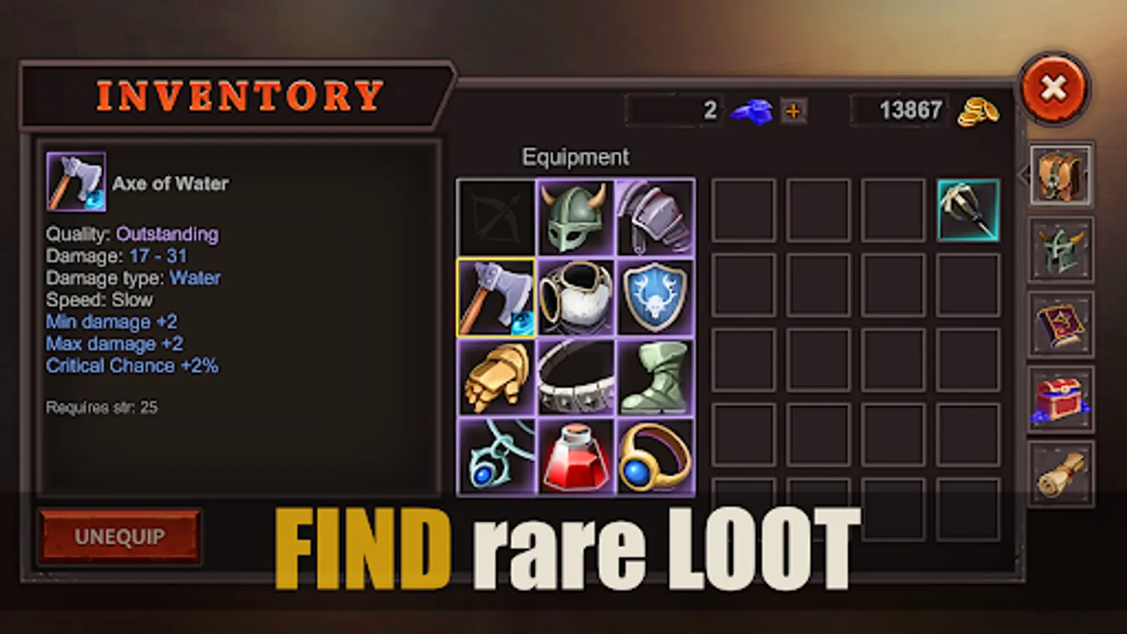 It takes the best from the classic 3D RPG offline games for free (story, level up character, items, stats, skill trees, city with shops, quests, bosses etc.) to the traditional dungeon crawler setting. It takes some elements from roguelike and roguelite games especially when played on hardcore.Unique classes