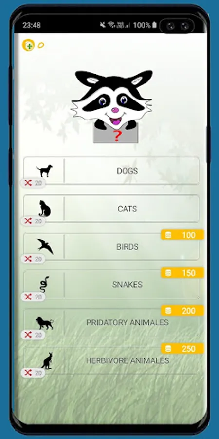 The “Animal Quiz” app include six different categories: dogs, cats, birds, snakes, predators, and herbivores. In the categories of dog, cats collected a lot of variety of breeds such as: German Shepherd,Golden Retriever, Labrador, Husky and many others. With categories "predatory" and "herbivorous" you will remember, which animals belong to these categories. The bird category will introduce you to different bird species. The category of snake will help you to know which snakes exist in the world.