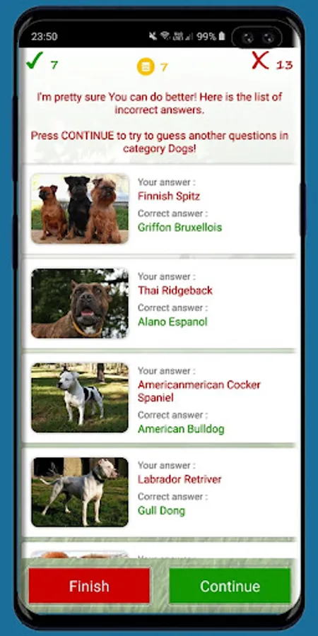 With this application you will expand your horizons in the animal world. And even if you have forgotten or don’t know the name of the breed or the animal, it’s not problem. Our application allows you to look at errors made during the test, allowing you to refresh your knowledge and not make any more mistakes.